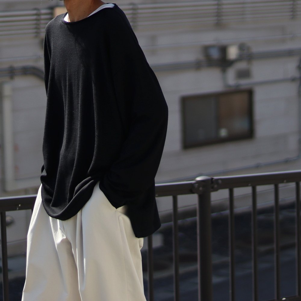 ゆったりとしたボックス型で袖にも裾にもリブが無く、それこそカットソー、ロンTEEのようにリラックス感を持って着られるニット。